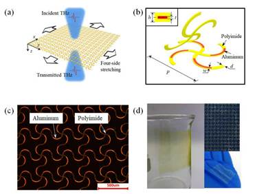对上述问题,李宇航老师团队研发了一款超薄柔性可实现动态调制太赫兹波传输的频率选择超表面。与传统调控方法不同,柔性可拉伸电子元件利用机械应变来动态调制太赫兹波。该超表面是基于蜿蜒结构力学设计方法得到的Al/PI周期性网状膜,无需弹性衬底,使得超表面的总厚度显著降低,总厚度仅为7μm。周期性Al/PI结构使超表面具有频率选择特性,可以阻止特定频率的太赫兹波通过。极低的厚度以及网状结构提供了柔性和可拉伸性,超表面可以被容易地拉伸、弯曲和扭转。通过简单地施加机械应变来诱导超表面产生变形,将会使太赫兹波透射率发生改变。
