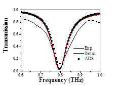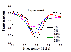 太赫兹时域光谱实验结果表明, 可拉伸超表面具有带阻频率选择特性,在施加28%的外部拉伸应变时,谐振频率的太赫兹波传输率可从0.15调到0.5,而频移只有3.4%。通过相应的电磁仿真和提出的LC等效电路模型,讨论了超表面的频率选择调制机理。