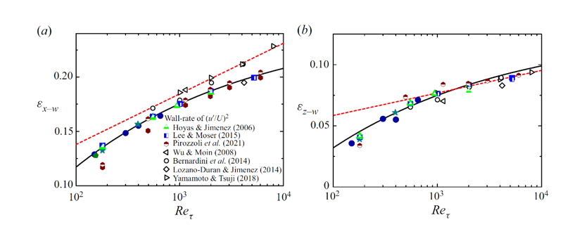 湍流边界层能量耗散率的最大值随着雷诺数增加而增大。(a)流向湍动能耗散率;(b)展向湍动能耗散率。实线为陈曦教授系列工作给出的理论预言,在雷诺数无穷大时会趋向于有限值;虚线是此前的对数增长模型,随雷诺数增加将发散于无穷。实形符号是全球范围内最大规模的槽道和圆管纳维斯托克斯方程直接数值模拟结果;空形符号是此前间接测量得到的数据。