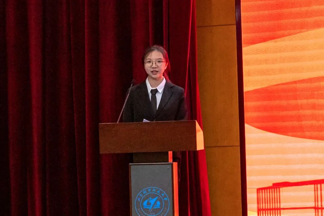 本科生新生代表2021级林佳妮围绕前辈们为航空航天事业鞠躬尽瘁、赴汤蹈火的精神,表达了对同学们的共勉与激励。林佳妮表示,一代代儿女前仆后继,为神州谱写锦绣华章,为中华铸就铁臂铜墙,我们这一代人也将扛起发展我国航空工业的担子,成为我国航空工业发展的中流砥柱。