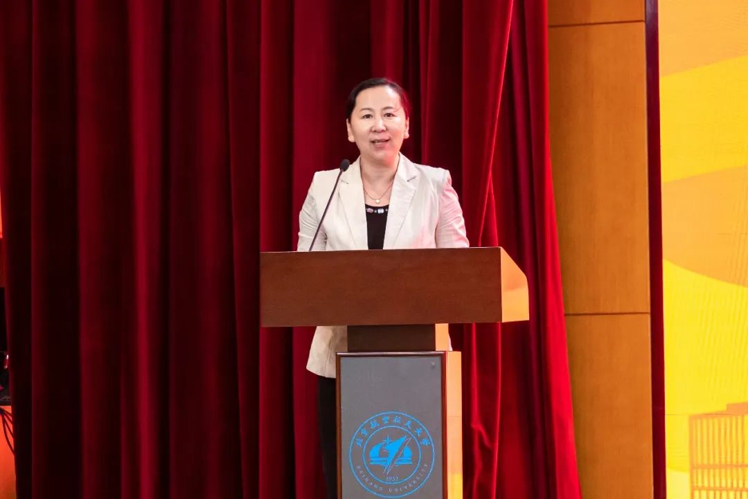 接下来,航空学院党委书记鲍蕊发表了讲话。首先,鲍蕊对各位新生的到来表示热烈的欢迎与诚心的期盼。接着,鲍蕊回顾航空学院的历史,缅怀鞠躬尽瘁的前辈,强调“空天报国”精神的传承,就培养模式、科创成果、师资力量三方面对北航航空学院进行了精简的介绍。鲍蕊表达了对新生的三点要求和期许:“空天报国情怀”“深厚学识素养”“领军领导潜质”,并鼓励新生心怀寰宇、脚踏实地、奋勇争先、再创辉煌。