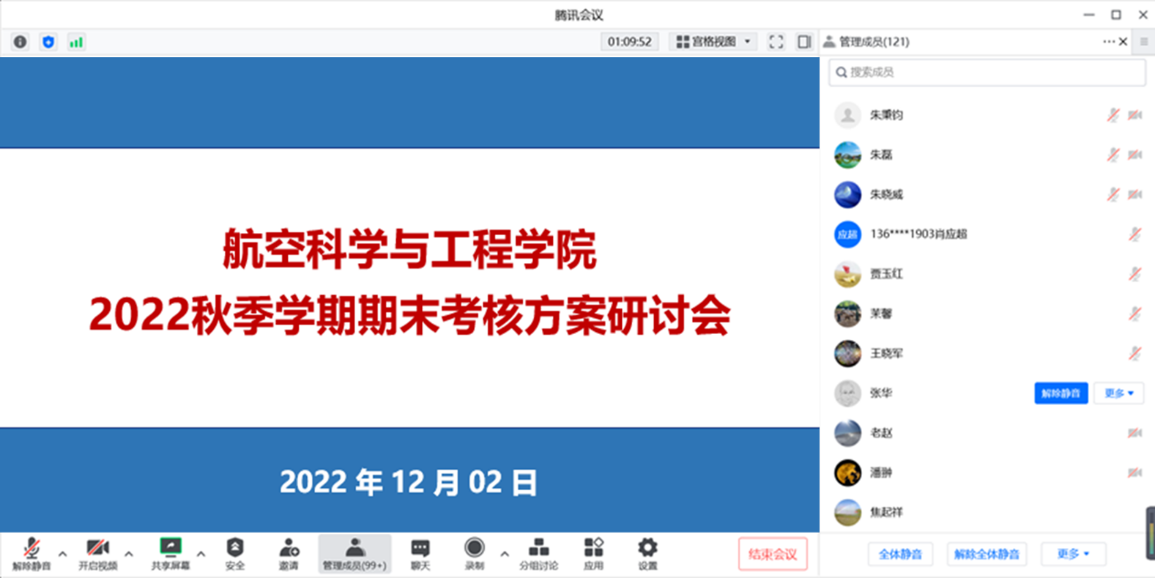 首先,航空学院教学副院长陈玉丽介绍了学院本研课程期末考核的总体情况,以及本研培养环节的开展情况,院长助理罗明强详细汇报了学院2022秋季学期线上期末考核工作方案。