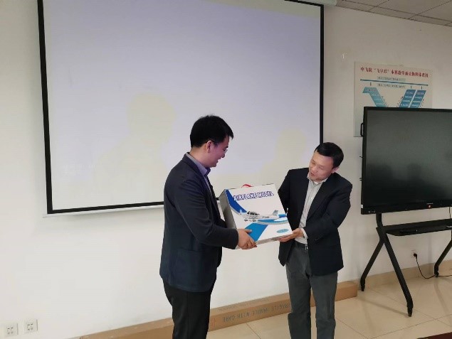 次日飞机系党支部教师一行驱车前往广汉,到中国民用航空飞行学院进行了参观与交流,先后参观的地点包括广汉机场(指控大厅、维修车间等)、航空发动机维修培训中心、模拟训练中心等多地,并与飞行技术学院和航空工程学院的部分院领导和教师代表进行了专门的技术座谈。会上,董雷霆副院长介绍了北航航空学院的科研发展情况,飞行技术学院的余江副院长和航空工程学院的付尧明院长分别介绍了两个学院在各自研究领域中的优势,飞行技术学院的杨俊书记和魏麟院长主持双方探讨了在通用航空领域的合作前景,以及在省部级重点实验室建设和学科建设方面的优势互补,并约定将进一步结合各自特点开展深度合作。会后,双方互赠了航空模型以示敬意。