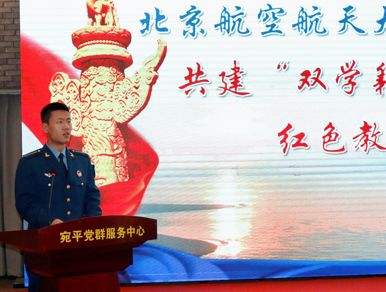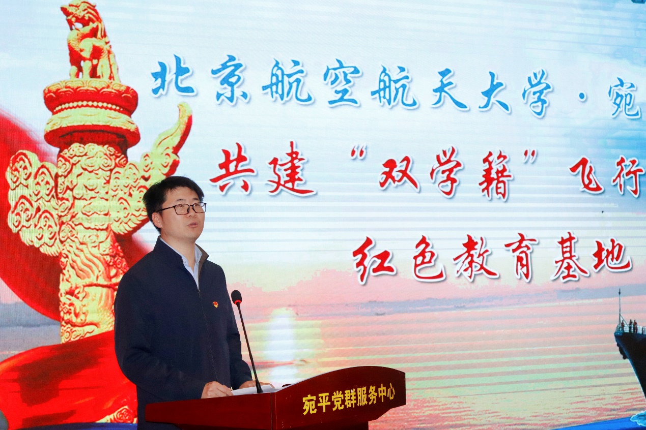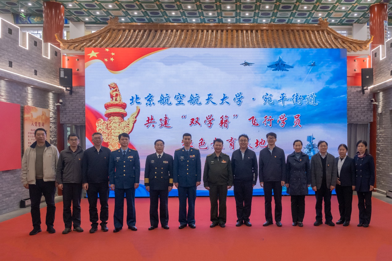 习近平总书记在第十四届全国人民代表大会第一次会议上提出,“我们要只争朝夕,坚定历史自信,增强历史主动,坚持守正创新,保持战略定力,发扬斗争精神,勇于攻坚克难,不断为强国建设、民族复兴伟业添砖加瓦、增光添彩!”4月4日下午,北京航空航天大学-宛平街道共建“双学籍”飞行学员红色教育基地仪式在宛平城举行。丰台区委常委、武装部政委张宏韬,宛平街道党工委书记杨勇;空军招飞局上校副局长蒋华峰,海军航空大学航空基础学院大校政治委员钟魁润,空军航空大学航空基础学院大校副政治委员赵振国,空军航空大学联合培养办公室中校主任李志鹏;北航党委常委、宣传部部长李建伟,学生工作部/党委武装部部长宋晓东,航空学院党委书记鲍蕊、院长潘翀,航空学院教授林贵平,学生工作部/党委武装部副部长张驰,学生中心副主任、航空学院党委副书记陈庆山出席仪式,北京航空航天大学全体 “双学籍”飞行学员参会。