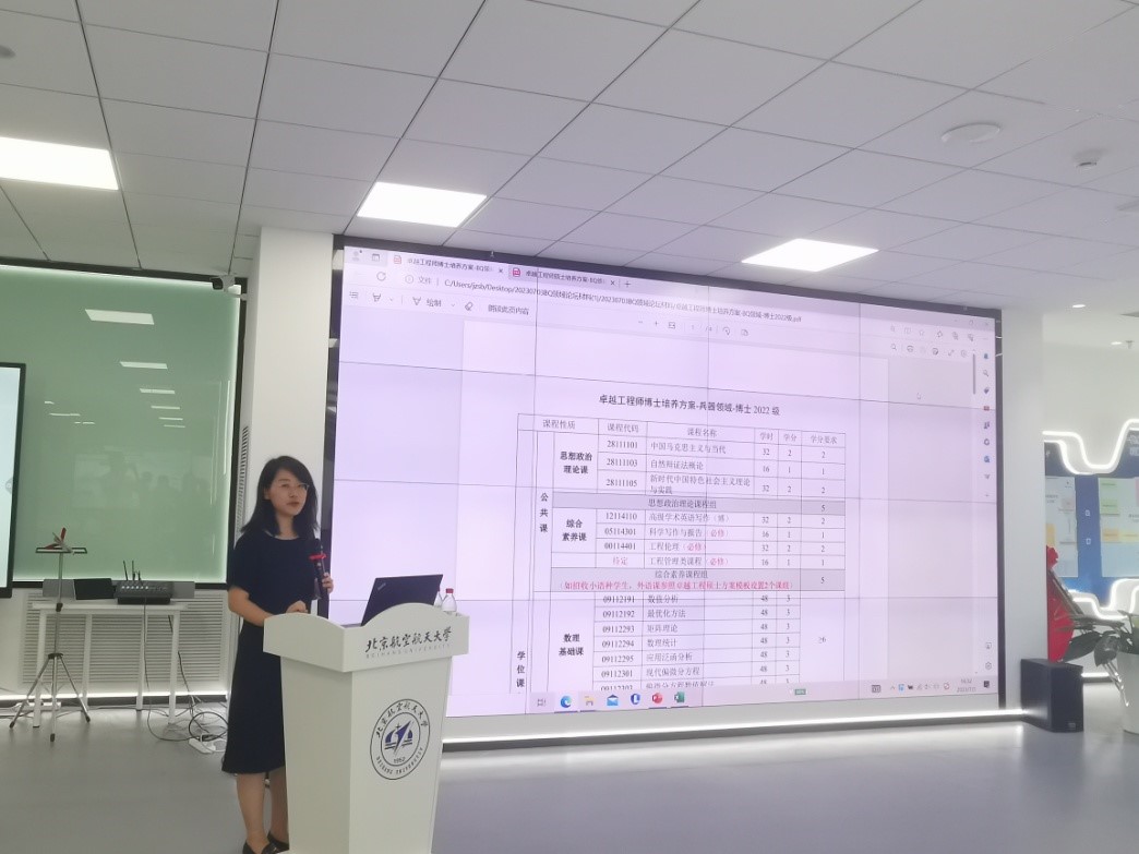 接着,航空学院副院长邵丽华介绍了北航兵器领域卓越工程师招生情况并汇报了现有卓越工程师培养方案的基本情况。她指出,为优化卓越工程师人才培养体系,将深入开展优质生源集纳、课程体系重构、学生能力重塑以及评价体系重建等工作,希望与会专家和导师代表提出宝贵意见和建议。