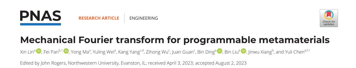 北航新闻网9月7日电(通讯员 杜金涛)2023年9月5日,《美国科学院院刊》(PNAS)发表了我校航空学院潘飞副教授、陈玉丽教授与向锦武院士、材料学院管娟副教授合作完成的研究成果“Mechanical Fourier transform for programmable metamaterials”(用于可编程超材料的“机械”傅里叶变换)。该工作提出了一种快捷高效的材料/结构力学性能逆向定制方法,将复杂非线性力学性能的逆向设计问题转化为超材料模块的应力应变曲线调幅问题,为先进材料和结构的按需定制设计提供了新的解决方案。航空学院博士生林新为文章第一作者,潘飞副教授和陈玉丽教授为共同通讯作者。北京航空航天大学为第一完成单位和唯一通讯单位。