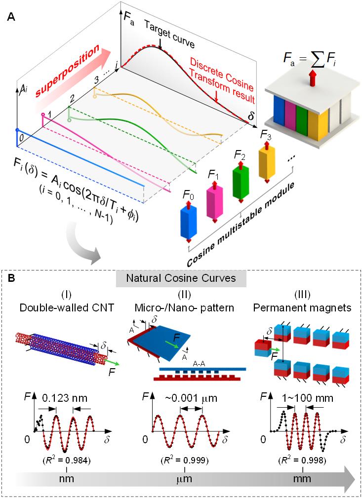 为了实现更复杂力学性能的定制,该团队提出了“机械”傅里叶变换(MFT)定制方法。该方法借鉴了傅里叶变换的思想,将任意的目标应力应变曲线分解为一条常值曲线和多条余弦曲线,每条余弦(或常值)曲线由一个余弦多稳态模块实现(图1)。将不同的余弦多稳态模块并联组装,形成阵列化超材料,即可快速得到目标力学曲线。这些余弦(或常值)曲线形成一个MFT谱,仅需在谱上进行幅值调制即可快速重定制新的目标曲线。