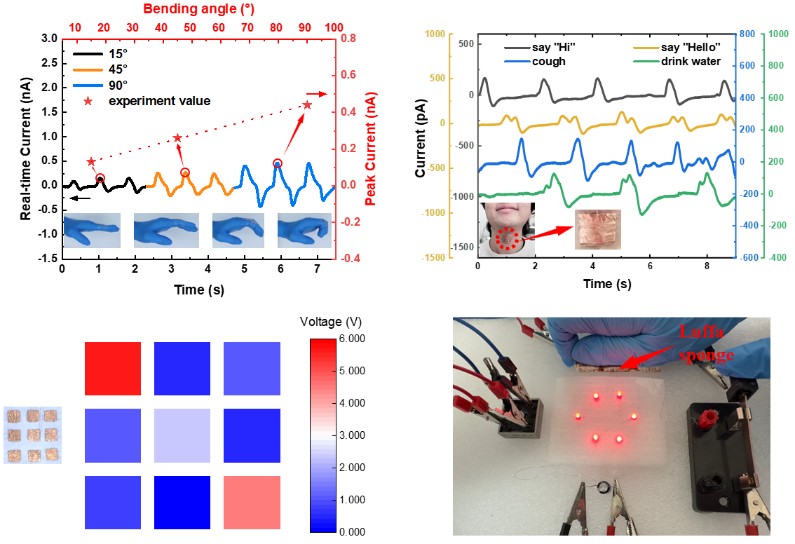 工作还展示了丝瓜络作为绿色智能传感器,用于检测机械变形、传感压力,识别声音/音节等;同时,也可以作为应变梯度发电机,经过对60×20×6mm3的丝瓜络按压几分钟后,其将机械能转换为电能,输出挠曲电流点亮了6个LED。作为绿色、环保、产量大,且价格低廉的天然材料,丝瓜络优异的力-电响应性能使其具有作为智能器件应用的巨大潜力。