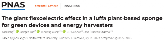 近日,我院固体力学所邵丽华教授与北京大学王建祥教授,美国工程院院士、休斯顿大学Pradeep Sharma教授合作,在国际顶级期刊《美国科学院院报》(PNAS)发表研究论文《The giant flexoelectric effect in a luffa plant-based sponge for green devices and energy harvesters》。该工作报道了天然生物材料—多孔丝瓜络的巨挠曲电效应,提出了一种将多孔生物材料作为绿色环保柔性发电机及其他智能器件应用的新策略。论文的共同一作是我院硕士研究生蒋雨滴(已毕业)和博士研究生闫东泽,邵丽华教授为论文的唯一通讯作者,北京航空航天大学为第一完成单位和唯一通讯单位。