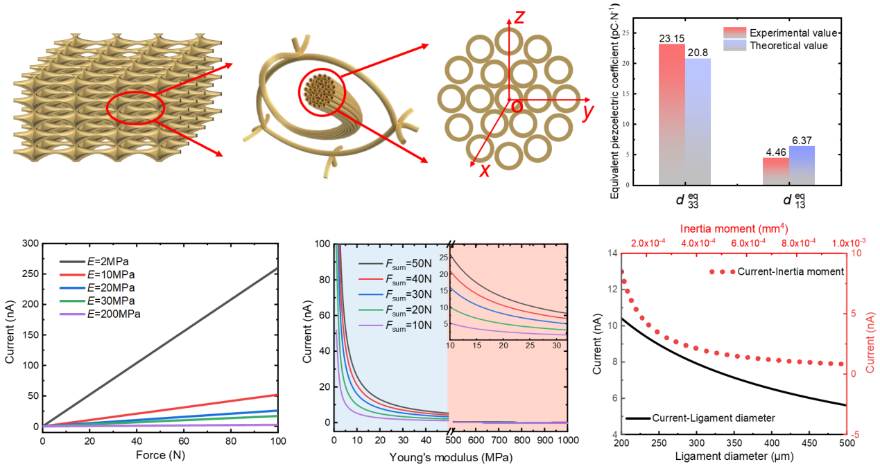研究者建立了分级多孔结构的力-电耦合理论模型,预测了其等效压电系数,并与实验结果进行了对比。理论分析表明,第一级多孔结构在宏观载荷作用下发生非均匀变形,同时第二级通孔结构通过降低韧带的截面惯性矩,增加了单根韧带的应变梯度,从而提高了该分级多孔材料的力-电输出性能。理论计算结果与实验结果吻合良好,揭示了该二级多孔结构的力-电耦合性能本质上是挠曲电效应的机理,并给出了电信号输出与宏观载荷成正比,与韧带的弹性模量、截面惯性矩和直径呈负相关的参数影响规律,可指导其他具有高力-电耦合性能的仿生材料设计。