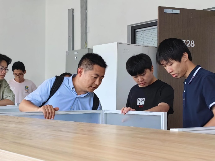 同学们首先参观了航空大楼门厅、电梯间、楼道间等公共区域,以及教师办公室、实验室、会议室等办公区域,之后,同学们重点参观了学生工位间。大家在现场实地感受了学生工位的材质、布局、空间以及储物功能等情况,并结合自己的感受提出了一些改进建议。学院党委副书记梁伟涛认真的向同学们介绍了学生工位的海选投票、招标采购、现场布置、功能设计等情况,并耐心解答了同学们的种种疑惑。在场的同学们纷纷表示,现有的工位设计充分考虑了同学们的隐私需要和储物需求,基本上能够满足大家的学习科研需求。同学们还在一些设计细节上提出了进一步改进的建议。