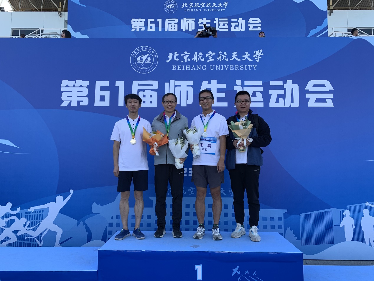 在团体竞赛项目中,凭借老师们出色的团队精神和极高的竞技水平,航空学院赢得了:男子4×400米团体(甲组)第二名;跳长绳团体(甲组)第三名;飞上云天团体(甲组)第三名。在个人竞赛项目中,宋晨老师赢得了男子400米比赛(甲组)第三名。