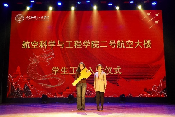 晚会举行了航空大楼学生工位入驻仪式,鲍蕊老师为将代表航空大楼学生工位使用权限的金色钥匙送到学生代表手上,并寄语同学们严格遵守工位使用管理规定,认真学习、刻苦钻研,在舒适崭新的环境中创造新的成绩。