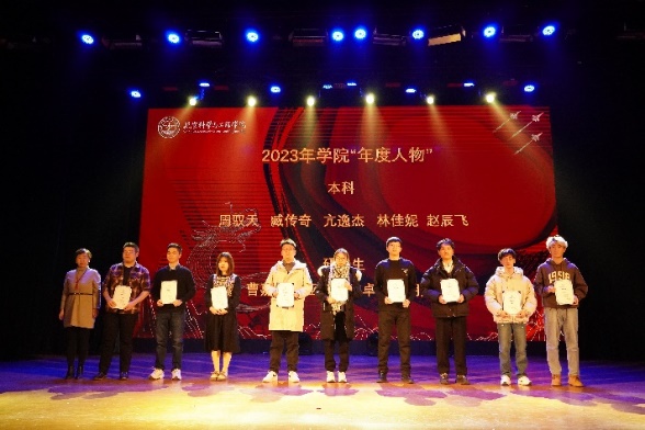 晚会进行了学生表彰,学院党委书记鲍蕊老师为获得2023 学生“年度人物”的同学颁发证书,主持人通过PPT介绍了在2023 年取得优异成绩的学生团队与个人的情况。