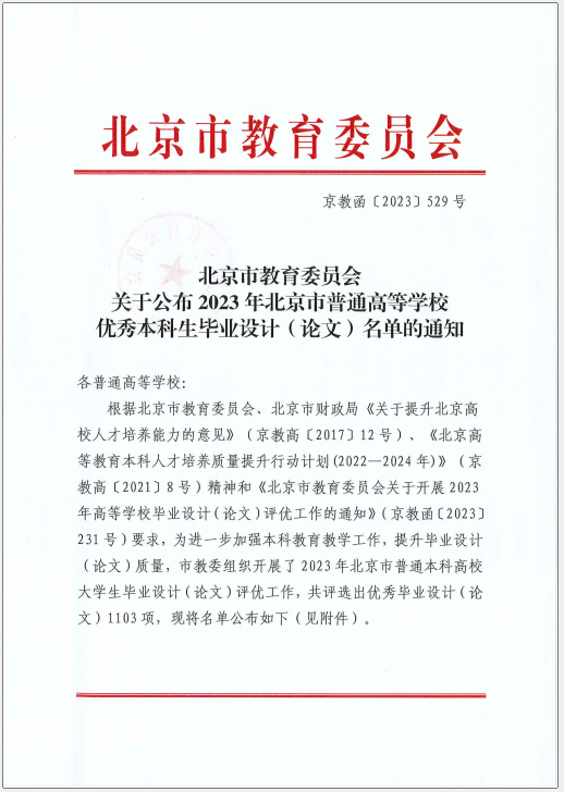 目前两届均获得北京航空航天大学本科校级优秀毕业设计(论文)和北京市普通高等学校优秀本科生毕业设计(论文)(团队类)。