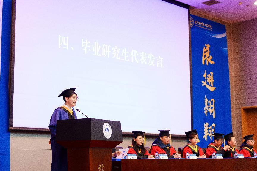 硕士毕业生丁飞作为毕业生代表发言。他回顾了自己在北航航空学院三年的求学经历,讲述了自己在北航学习生活的收获体会,通过科学研究体会追求真理的乐趣,通过科技竞赛领悟实践出真知,在空天文化的浸润下心系国家、勇担时代重任。他感谢了学院和导师对自己的培养和帮助,并鼓励所有毕业生同学要勇于引领、勇于创新,做祖国航空航天事业的推动者,在新的人生征途上传承弘扬以空天报国为内核的北航精神,牢记使命,奋勇拼搏,再创佳绩,为国家航空事业发展做出应有贡献。