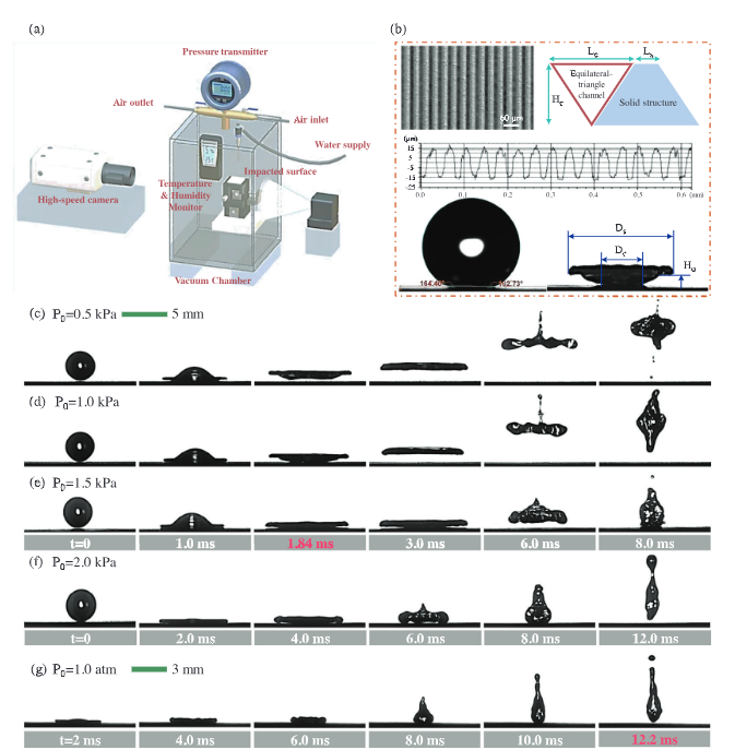 近日,我院文东升教授团队,在极端环境下超疏水表面基础研究方面取得重要研究进展。团队基于自主设计搭建的低压实验系统,研究发现在室温、近真空(环境压力3 kPa以下)环境条件下,液滴撞击超疏水表面时会发生极快的饼状弹跳现象,液滴与表面的接触时间能够大幅降低85%,达到目前已知最高水平。2024年3月18日,相关研究成果以《Low-pressure Pancake Bouncing on Superhydrophobic Surfaces》为题在线发表于国际知名学术期刊《Small》杂志,并被选为编辑推荐(Editor’ Choice)。