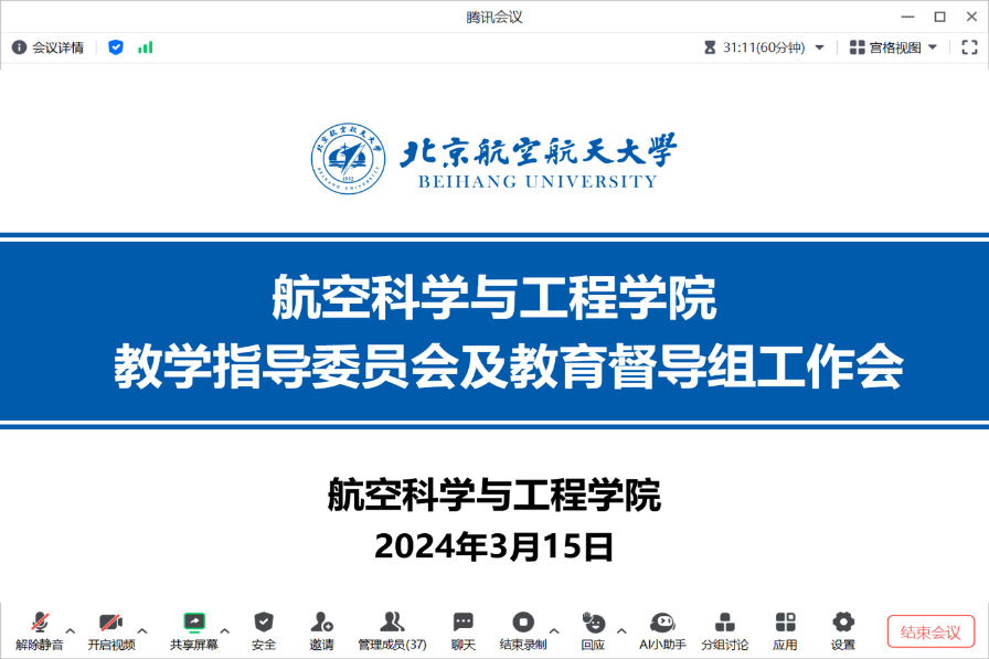 365英国上市公司于3月15日晚线上召开了2024学年春季学期第一次教学指导委员会及教育督导组工作会议,航空学院副院长罗明强、邵丽华,学院教指委及督导组委员,各所系本研教学副主任等30余人参加了会议,会议由航空学院教指委及督导组组长林贵平主持。