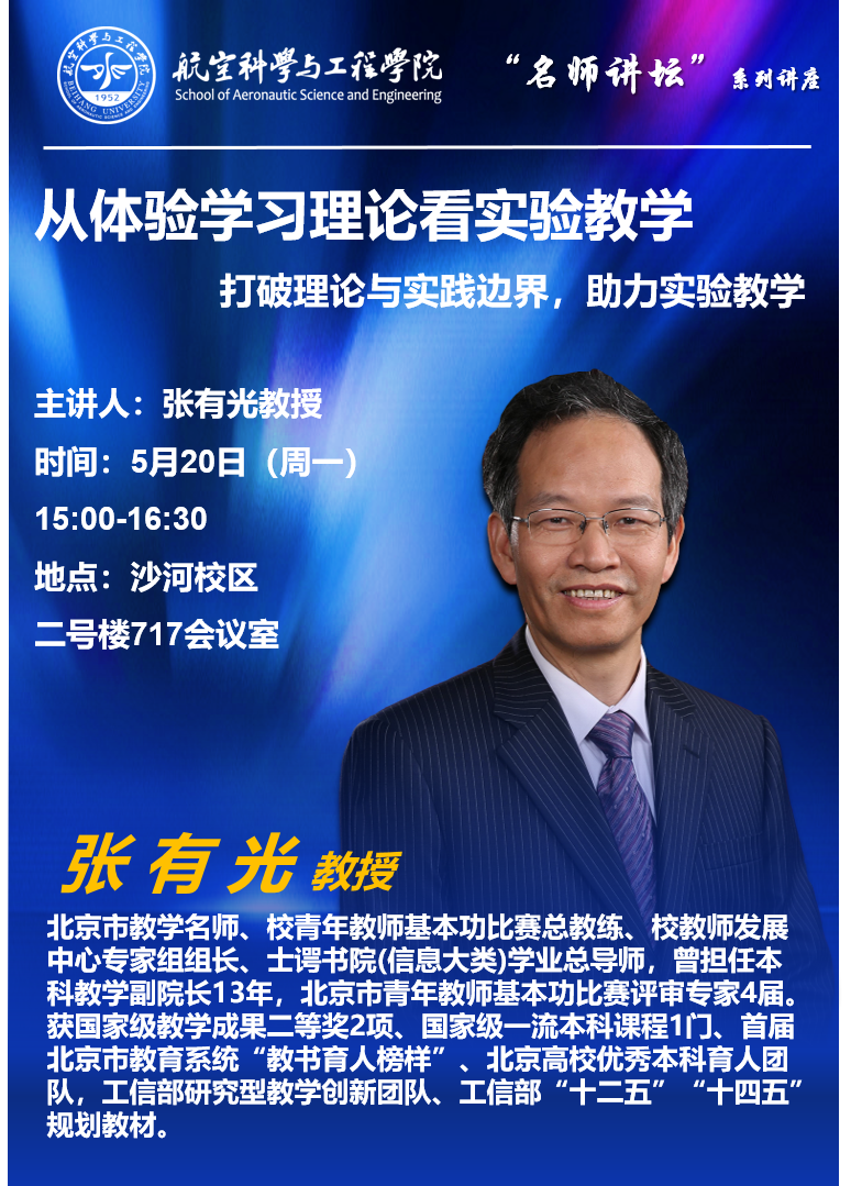 为促进青年教师教学发展,帮助青年教师过好“师德关”“教学关”“育人关”,加强教师教育教学能力提升体系建设,助力青年教师成为人才培养生力军,5月20日下午,365英国上市公司在沙河校区举办“名师讲坛”讲座。讲座邀请了北京市教学名师张有光教授,为各位教师带来主题为“从体验学习理论看实验教学”的专题讲座。参会的代表有航空学院副院长罗明强,航空学院实验教学中心主任李可,航空学院实验教学中心副主任王松等10余名骨干教师。
