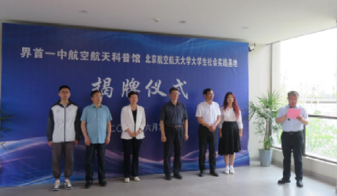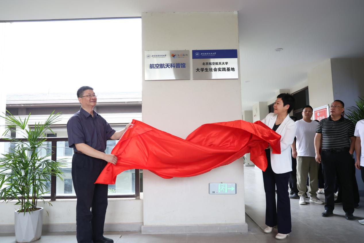图为杨超教授和卢萍副市长共同为航空航天科普馆和北京航空航天大学大学生社会实践基地揭牌