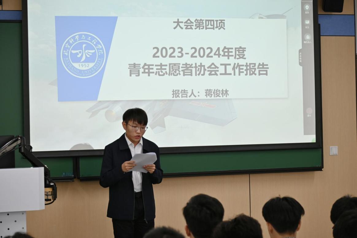 第一届青年志愿者协会会长蒋俊林进行了2023-2024年度青年志愿者协会工作报告,用“行”“稳”“致”“远”四字概况青协过去一年的工作,青年志愿者协会作为初创组织,以饱满的热情服务全院师生,组织各类志愿实践活动,“奉献情怀在心间,奋勇拼搏正少年”,字里行间,是殷殷之情,是拳拳之心。新一届的青年志愿者协会将以攻坚克难、砥砺奋进的拼搏热情继续努力,举办让同学们满意的活动。