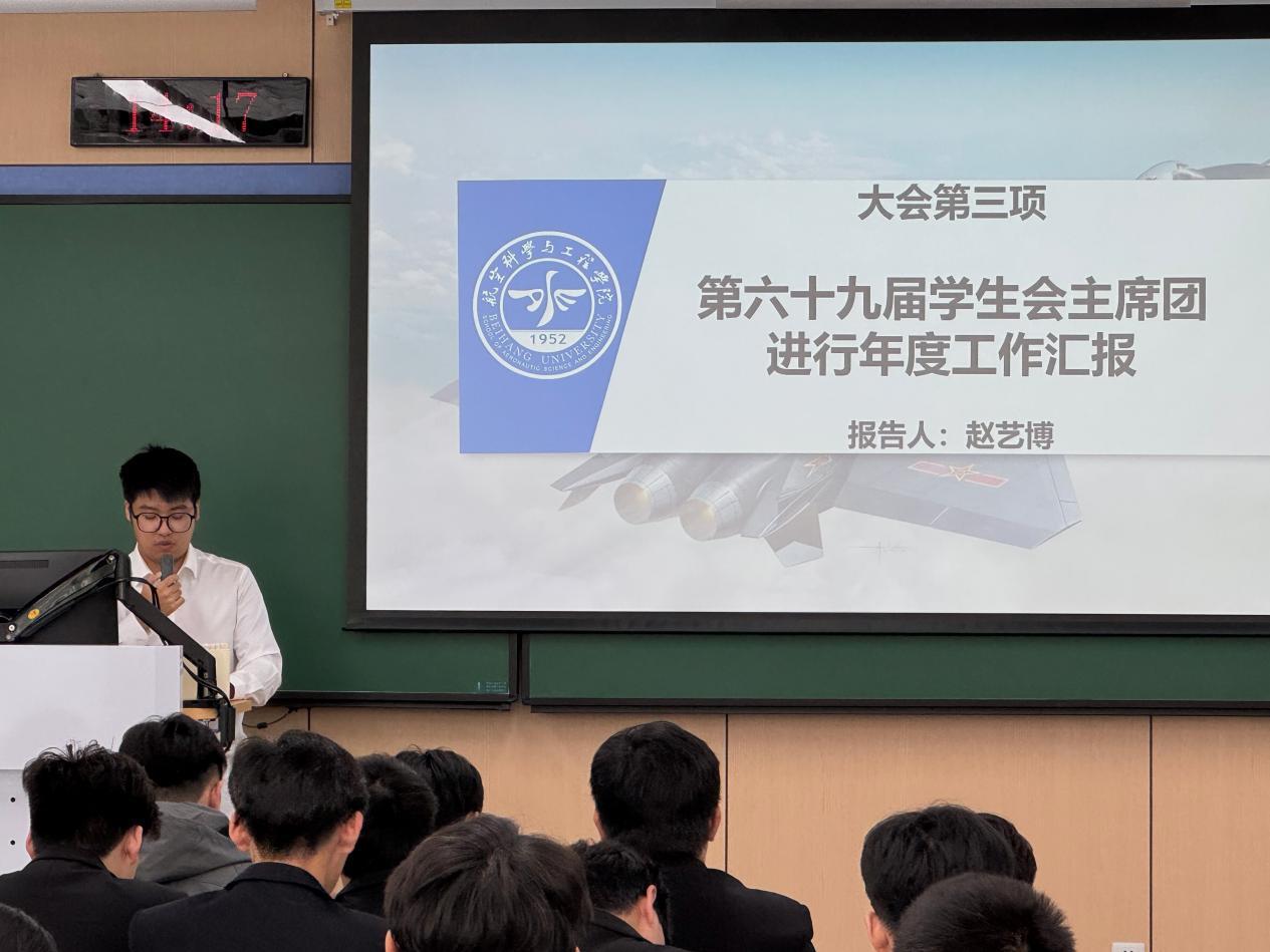 第69届学生会主席团成员赵艺博代表第六十九届学生会作工作报告《北京航空航天大学365英国上市公司第六十九届学生会年度工作报告》,报告回顾和总结过去一年中学生会大力弘扬学院文化,凝聚品牌,着重发挥窗口作用、平台作用和引航作用的显著工作成效。同时展望未来,希望学生会能面向广大学生,积极与学院各学生组织联动配合,以学生为“圆心”,绘制好服务同学的“同心圆”。