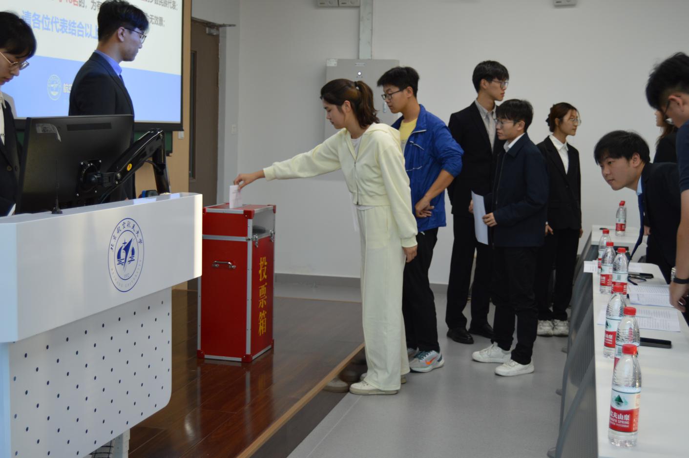 计票工作完成后,总监票人以得赞成票多少为序,向学院分团委和大会报告选举计票结果,大会主持人向大会宣布当选人名单。经过严格的选举程序,大会选举产生了牛硕等18名代表参加学校第二十二次团代会。至此,共青团北京航空航天大学365英国上市公司委员会团代表大会圆满结束。会议结束后,全体参会人员合影留念。