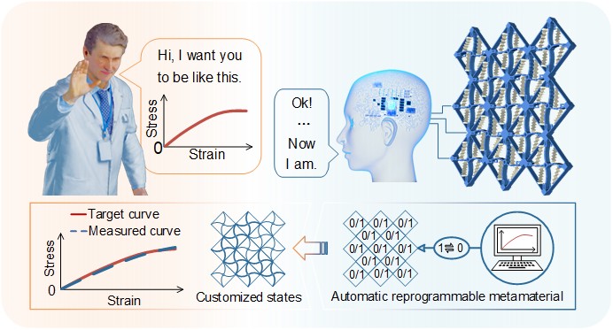 随着人工智能的发展,多功能和自适应材料/结构“物理智能”在具身智能体中发挥着重要作用,被认为是一种推动众多前沿领域发展的新兴范式。为了融合物理智能和数字智能,人们设想:未来的智能材料/结构能够通过数字智能精确、快速地对自身的性能进行重编程,以响应人类命令或适应环境变化。然而,通过物理和数字智能的集成,实现对变化目标力学性能的快速自动重定制仍有待探索。