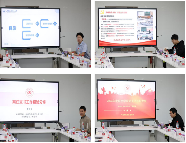 6个学生党支部书记紧密围绕学习贯彻党的二十届三中全会精神和全国教育大会精神,落实校院两级党建重点任务,对标《北京普通高等学校党建和思想政治工作基本标准》,就支部班子建设、组织生活开展和特色党建活动等方面,依次进行年度工作述职汇报及评优答辩。与会同志围绕支部工作细节、创新做法可行性等问题进行提问交流。随后,2位近期离任优秀支书代表从支部日常管理、党员培养、党建活动策划与执行等方面,分享任期内积累的工作心得和宝贵经验。