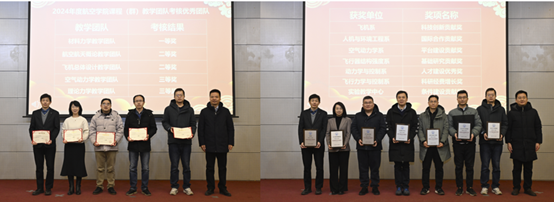 紧接着进入航空学院2024年度教育教学表彰环节。学院对在课程与教材建设、教学改革与平台建设、教学成果、教师发展以及优秀教学团队等方面表现突出的个人和团队进行了表彰。教务部部长钱政为2024年度航空学院优秀课程教学团队代表颁发证书,激励广大教师在教育教学工作中积极进取、追求卓越。学院党委书记董雷霆教授为飞机系、人机与环境工程系、空气动力学系、飞行器结构强度系、动力学与控制系、飞行力学与控制系、实验教学中心7个基层组织颁奖。台下掌声雷动,这是对过去一年工作的肯定,更是对未来发展的热切期盼。