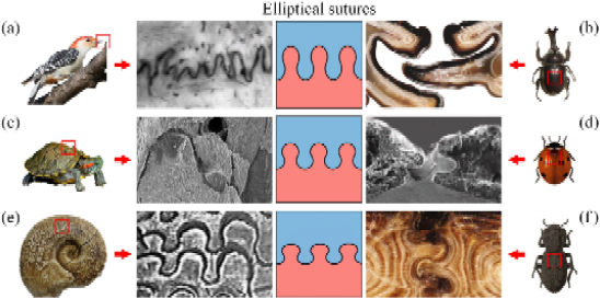 如图1所示,类椭圆型骨缝广泛存在于各类生物结构中。椭圆骨缝与其他类型的骨缝有较大差异。例如,椭圆骨缝在垂直于界面的方向上可以具有很强的互锁效应,这是正弦型等骨缝所不具备的特性。具有椭圆骨缝的铁甲虫可以承受高达自身重力39000倍的压力。然而,这其中的力学机理、椭圆型骨缝的力学优势等尚不清晰,有待进一步深入研究。