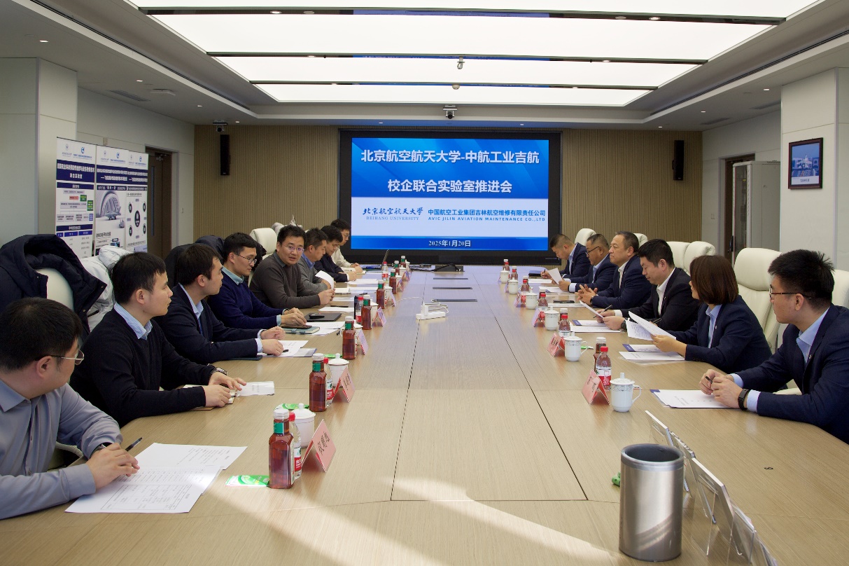 (通讯员 马云鹏)2025年1月20日,“北京航空航天大学-中航工业吉航校企联合实验室工作推进会”在北京航空航天大学沙河校区科研二号楼716会议室举行。吉航公司党委书记、董事长冯永刚,副总经理、总工程师武胤,组织部、人力资源部部长徐忠江,技术部部长齐特,新机型号办党支部书记樊会鲜,党群综合部副部长宋鹏,北航科研院国防科研处科技工业室主任赵琪,航空学院党委书记董雷霆、党委副书记梁伟涛、科研副院长周尧明,重大项目办公室主任、联合实验室副主任马云鹏及相关老师出席了会议。