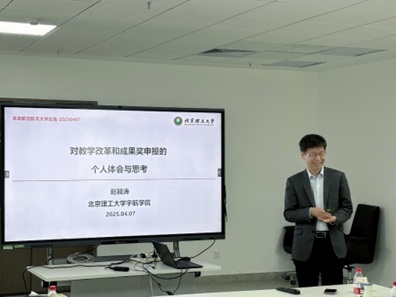 会议伊始,赵颖涛教授结合自身教学改革与成果奖申报经验,以“成果培育、撰写要点、申报体会”为主线展开分享。他系统阐释了“工程科学家贯通培养”的创新理念,结合北理工力学专业的教学改革思路与实践,深入剖析如何通过课程体系重构、科研反哺教学等路径培育高质量教学成果。针对申报材料撰写,赵颖涛提出“体现特色+逻辑自洽”的撰写原则,并以教学成果奖申报书为例,解析如何精准提炼创新点、科学整合支撑材料。他还提醒教师“成果申报需长期布局,注重团队协作与资源联动”,为与会者提供了系统性思路。