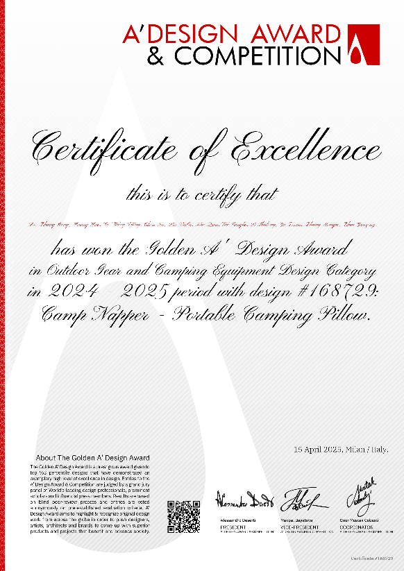 "Restbase Camp Napper小睡枕"荣获A' Design Award金奖(top 1%),这款针对碎片化休息场景设计的创新产品完美融合了舒适性与便携性。王黎静团队依托完成成年男性头型三维尺寸国家标准(GB/T 23461-2009)中积累的技术成果,提炼出符合亚洲成年人头部曲线特征的关键尺寸参数,通过仿真模拟,构建不同睡姿下头部压力分布模型,为小睡枕的曲面弧度设计、支撑点布局提供科学依据;张融团队凭借其工业设计研究方向的深厚底蕴,在产品的创新形态、材料应用及用户体验优化方面提供了关键方案,将头部压力分布模型转化为可视化设计语言,使枕体曲面弧度、支撑点布局既符合科学数据,又兼具艺术美感。