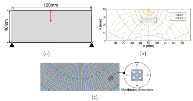 该工作进一步将此模型应用于各向异性结构的宏观共形设计之中,包括(1)在点阵的排布与方向层面,提出了一种基于主应力线的点阵设计方法,通过傅里叶变换实现固体“波”的网格映射,实现材料最优性能方向与主应力线的对齐(如图2 );(2)在梯度设计层面,该工作实现了多构型条件下拓扑优化灵敏度的统一表达格式,建立了面向TPMS共形点阵的多尺度优化框架。