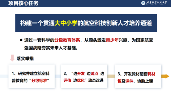 会议首先由宋磊老师作主旨发言,他阐述了项目背景,系统介绍了学校国家级一流课程与实践教学体系,展示了从航空理论到微小型飞行器创新设计的完整培养链条,并分享了将《飞行原理》等课程资源通过线上平台向社会开放、取得良好传播效果的经验。他强调,高校教育理念正转向“以学生为中心”的能力培养模式,希望能将这一理念与优质课程资源辐射至基础教育阶段,构建从小学兴趣启蒙、初中探究思维养成到高中工程实践衔接的阶梯式育人路径。