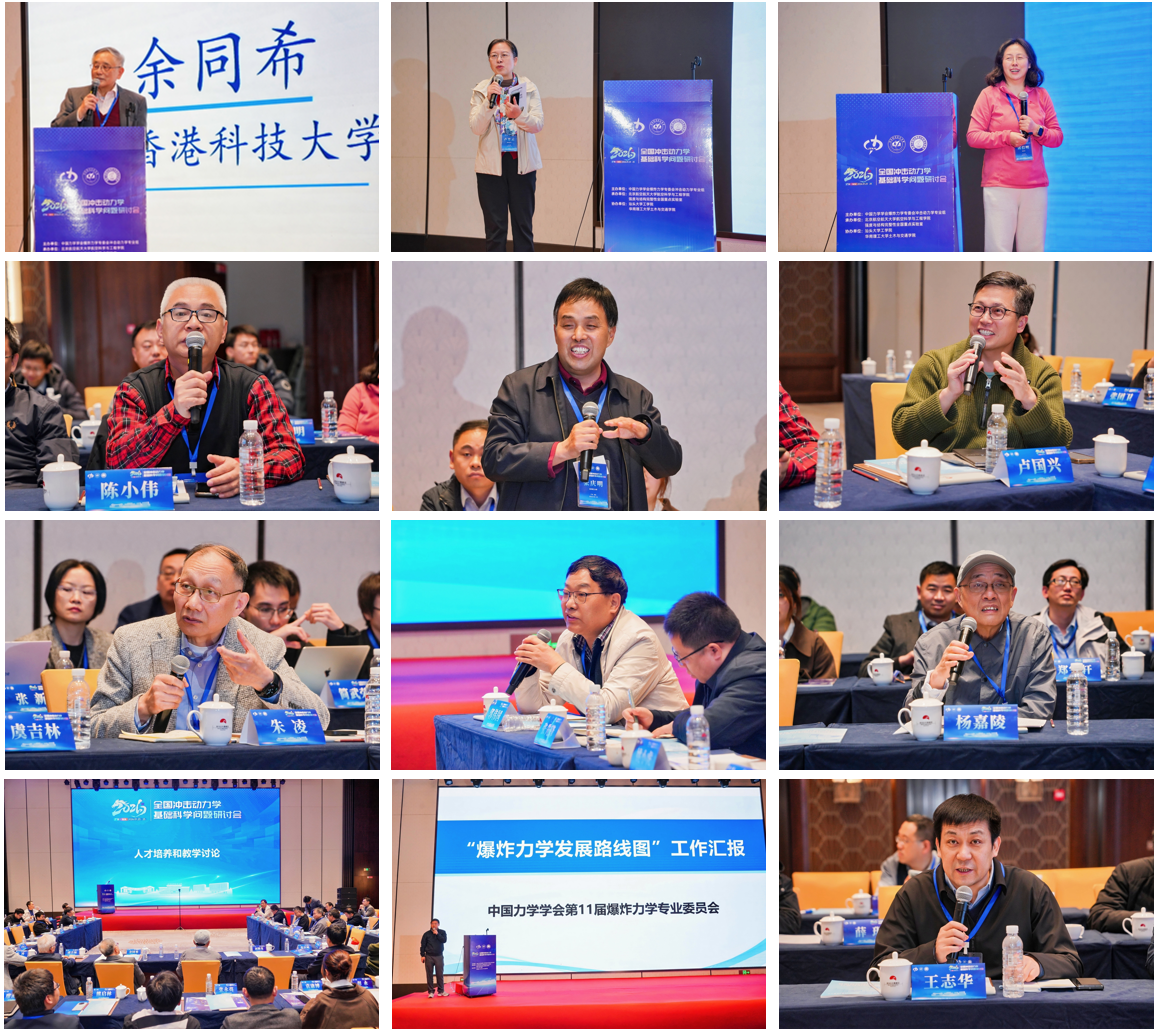 本次会议的研讨交流环节分为人才培养及教学研讨、爆炸力学工作汇报环节,在人才培养及教学研讨中,香港科技大学余同希教授、国防科技大学卢芳云教授、清华大学邱信明教授、北京理工大学张晓伟教授分别作了题目为《对研究生培养的两点管见》、《冲击动力学相关课程建设调研与思考》、《清华大学冲击动力学课程介绍》、《北京理工大学力学工程系人才培养情况》的报告,北京理工大学张庆明教授及陈小伟教授、西北工业大学郭伟国教授及郭亚洲教授、武汉理工大学朱凌教授等专家针对各自单位的人才培养及教学情况进行了介绍,各位专家学者结合多年的教学经验和亲身体会与参会代表分享了关于冲击动力学人才培养和课程体系建设等方面宝贵的思考和见解。在爆炸力学工作汇报环节,中国科学院力学研究所蒋敏强研究员代表爆炸力学专委会进行了爆炸力学发展路线图与科协年会专题论坛工作汇报,旨在促进爆炸力学学科发展,更好地服务国家战略与国民经济的需求。研讨交流环节分别由北京航空航天大学杨嘉陵教授和太原理工大学王志华教授主持。