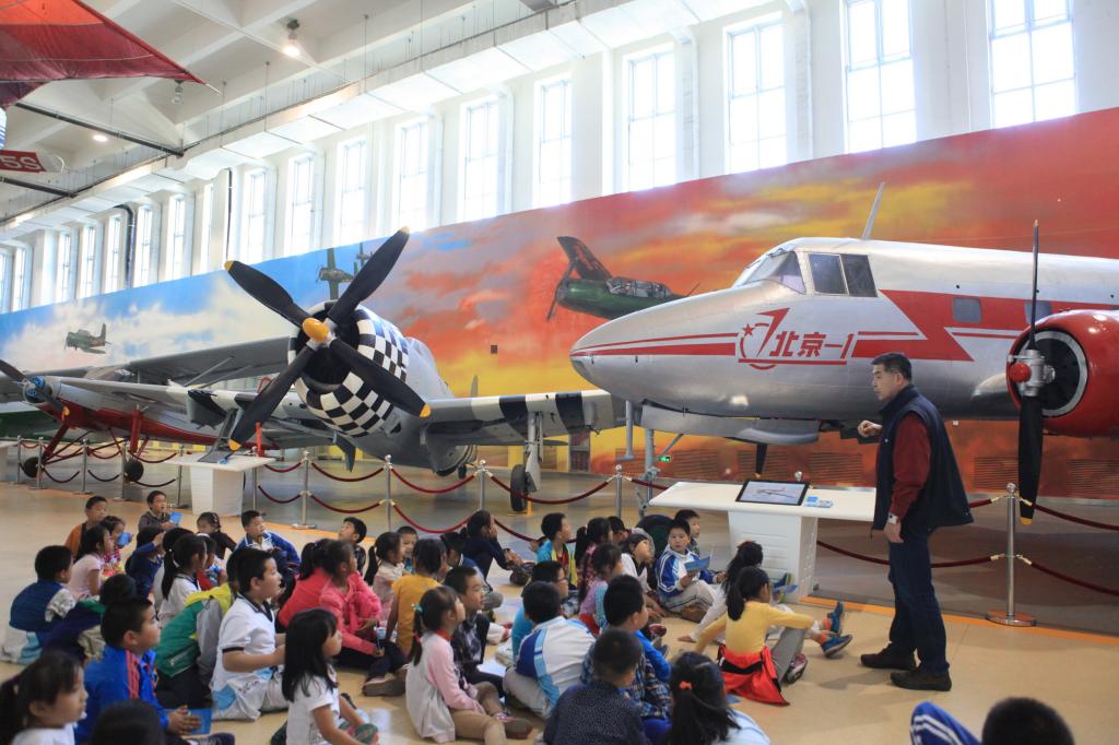 韩馆长一路走来,面对着一架架熟悉的飞机,娓娓道来,不仅为孩子们讲解知识,还穿插着提问和回答。你们看,它的机翼在机身的什么位置呢?为什么有的飞机机翼是向上翘起来的,有的则是向下的?飞机为什么是3个点着陆呢?在一个个问题中,孩子们对飞机从懵懂到略有所知、到兴趣盎然,一个个睁着大大的眼睛注视着韩老师。当然了,作为航空航天特色校北航附小的小学生,对飞机的兴趣和求知的欲望也是令人赞叹的。孩子们不时举起小手,提出一个个看似幼稚、却反映出孩子们确实在观察和思考的问题。这个飞机为什么没有机翼呀?飞机里是空心的还是实心的呢?飞机里面都放什么东西呀?油箱被打掉了飞机是不是就坏了?飞机的重量是不是还要加上人的重量呀?等等等等。