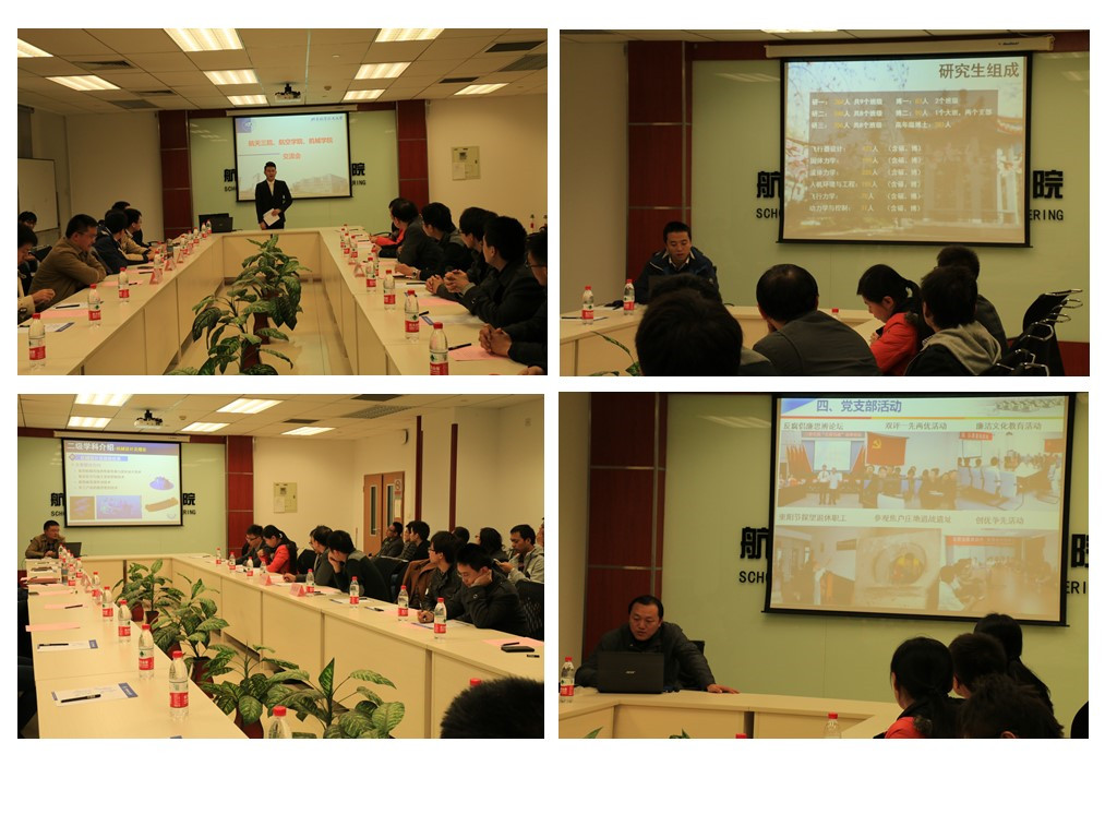 交流会于下午3点在C706准时开始。首先,航空学院研究生指导主任蒋崇文老师和机械学院研究生指导主任从保强老师分别介绍了各自学院的基本概况,包括专业方向设置、研究生教学及科研、研究生特色活动等。随后,航天三院三部九室叶伟峰主任介绍了三部及九室的专业技术特色、研究方向等情况。叶主任对本次交流活动给予了高度评价,他指出,交流会是一个校企交流的宝贵机会,加强了在校学生与航天三院的相互了解。