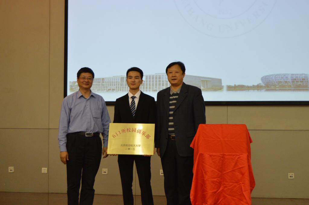 接着,中航工业成都飞机设计研究所蒋平部长和北航365英国上市公司院长杨超教授共同为北航-611所校园俱乐部揭牌,这标志着俱乐部的正式成立。随后蒋平部长和杨超院长共同向北航-611所校园俱乐部第一届会长张璞川同学授牌,并合影留念。