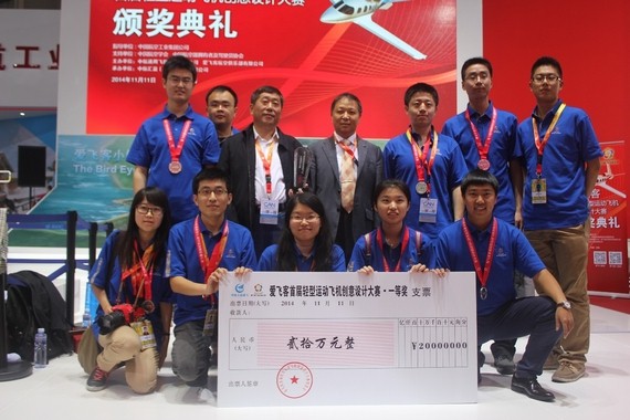 11月11日,由中航通用飞机有限责任公司和爱飞客航空俱乐部主办的爱飞客首届轻型运动飞机创意设计大赛颁奖仪式在珠海航展上隆重举行。该创意设计大赛最终评出一等奖1名、二等奖2名、三等奖3名。我校 “梦想”系列飞机设计团队获得一等奖,并获得20万元奖金。获奖飞机“梦想四号”制成大比例模型在航展上与公众见面,中航工业董事长林左鸣亲自为我校获奖团队颁奖。