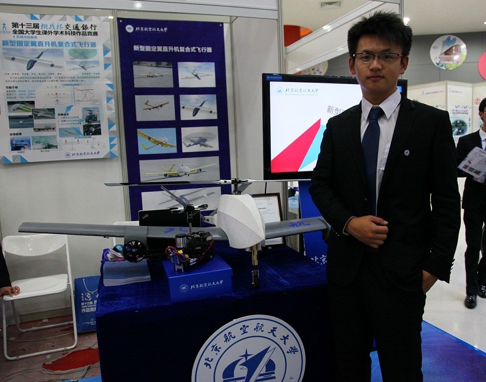 在和航模队战友们一同奋战的同时,为了积累经验,朝着更高的平台迈进,张啸迟积极联系导师,虚心请教,逐步开始了个人的独立项目——新型固定翼直升机复合式飞行器的设计制造工作。每一个了解到他的想法的人都投来了惊讶和怀疑的眼光,惊讶的是他敢想敢做,敢于闯这未知的世界,怀疑的是一个大二的学生能否完成这项艰巨的任务。他设计的复合式直升机,兼有旋翼和固定翼两种形态。在直升机模式下,通过旋翼垂直起降,达到一定高度和前进速度后,将旋翼锁定切换成常规布局模式,变为双翼固定翼飞机,可实现高速飞行,从而从根本上的解决了旋翼的气流不对称对速度的限制,兼具高速和高机动性。而张啸迟同学的这一种具有可行性的解决方案,在现代航空上将具有重大意义。从此,张啸迟为了他这个梦想,开始了蛮长的科创之路,期间失败接踵而至,但他不曾放弃。最终项目组在该型飞行器的航向控制技术方面有了显著地进展,并且成功完成了数次试验,总结出了针对该复合式飞行器双工况水平推进系统的技术重点,为后续的工作打下坚实基础。并且凭借这一年的工作,张啸迟与小组成员获得了第二十二届“冯如杯”科技竞赛的二等奖。