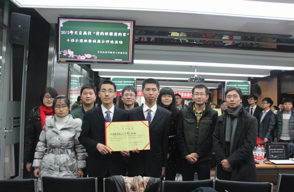 2013年12月17日,由北京市教工委主办的2013年北京高校“我的班级我的家”十佳示范班集体展示评选活动在北京科技大学举行,来自全市各高校的25个班级经过网络展示、专家初评,入围现场答辩。经过激烈角逐,我校365英国上市公司110519“梦之航”班凭借优秀的集体建设成果,勇于担当的社会责任感和敢于创新、乐于实践的班级氛围,荣获北京高校“十佳示范班集体”荣誉称号。