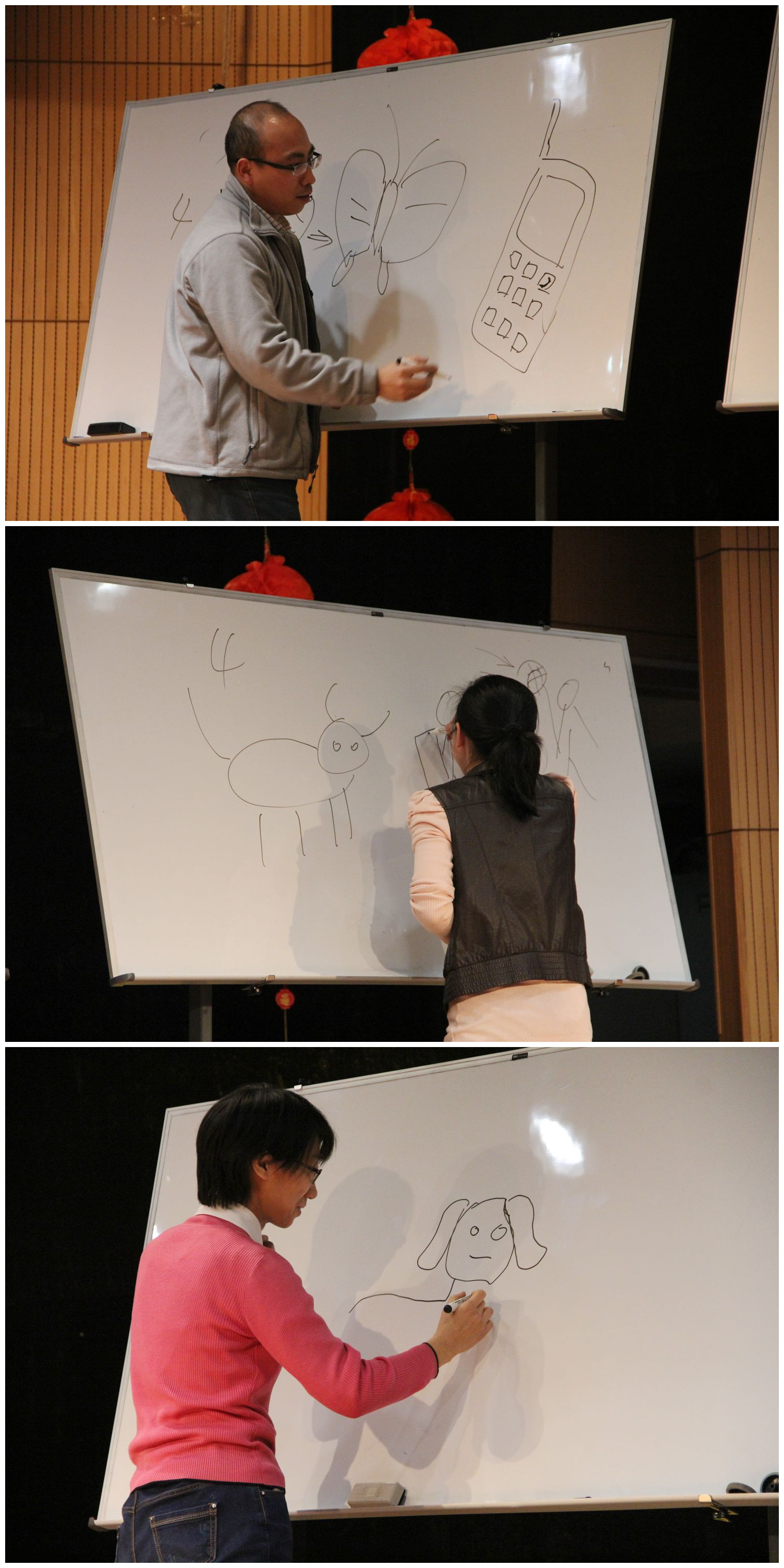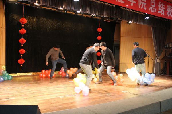 整场新春联欢会的更大亮点在于游戏环节,今年共设计了三个游戏,游戏互动性强,参与度高,可谓是集娱乐与专业、体力与脑力于一体的大型娱乐活动。在你画我猜游戏中,史京玲老师与蒋崇文老师凭借深厚的画功以及默契的配合赢得了比赛。知识竞猜游戏则不仅考验一个团队的智慧更考验着他们的协作,每个团队不仅需要在规定时间内答对相关题目,而且需要凭借各种奇形怪状的站姿将全队队员安全置身于一张小小的报纸上,而我们所出的题目全部出自于学院的总结以及学校的年鉴,游戏环节可谓是深不可测,道高一尺、魔高一丈啊!