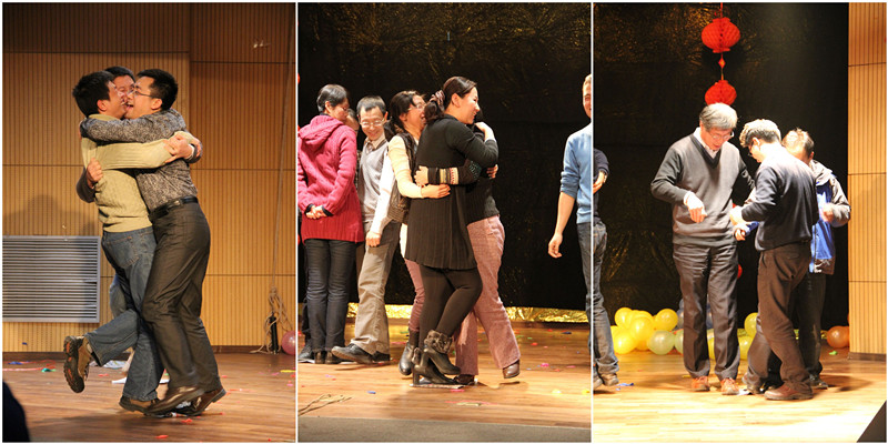 随后,学院新春联欢会在由四位年轻老师合作的红歌联唱中正式拉开帷幕,伴随着一首《革命人永远是年轻》全院老师一张张年轻的照片跃然于大屏幕上,虽然岁月在每位老师的脸上留下了时间的印记,但这正是多年来每位老师辛勤奉献学校以及学院建设最好的历史鉴证。固体所一则自编、自导,发动全所大部分教师自演的语言类节目《新闻联播》将整场联欢会推向了高潮。《新闻联播》以当前大家关心的热点问题为线索,结合相关专业知识,再适当加入艺术元素,让大家在一笑之余留下了一丝思考。
