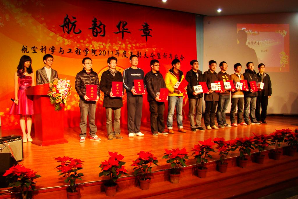 首先举行的是年度表彰大会。会上表彰了2011年航空学院的学习进步奖、优秀学生党员和优秀导生等三项个人奖项,以及本科卫生标兵宿舍、优秀班集体和学院优秀团队等三项集体奖项,最后隆重表彰了2011年航空学院十佳明星,并由学院领导为获奖学生颁奖。