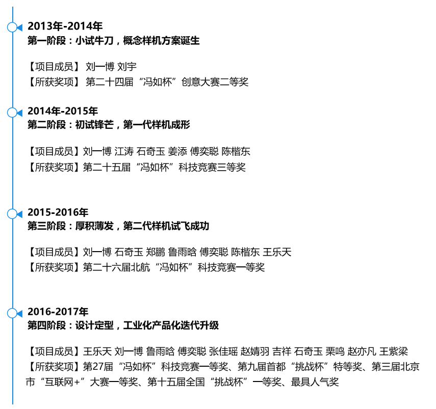 在这一阶段,项目的新生代成员担起重任,不仅仅满足于一款优秀的学生科技作品,而以实际市场需求为导向,完成了从学生科技作品向工业化、商品化产品的迭代升级,获得北航飞行力学与安全系关键技术支持的同时,也与美国pix工程师取得联系进行技术沟通,同时获得了大创、SRTP等共二十万元科研经费资助,并不断迈向更高舞台,斩获诸多重要奖项。