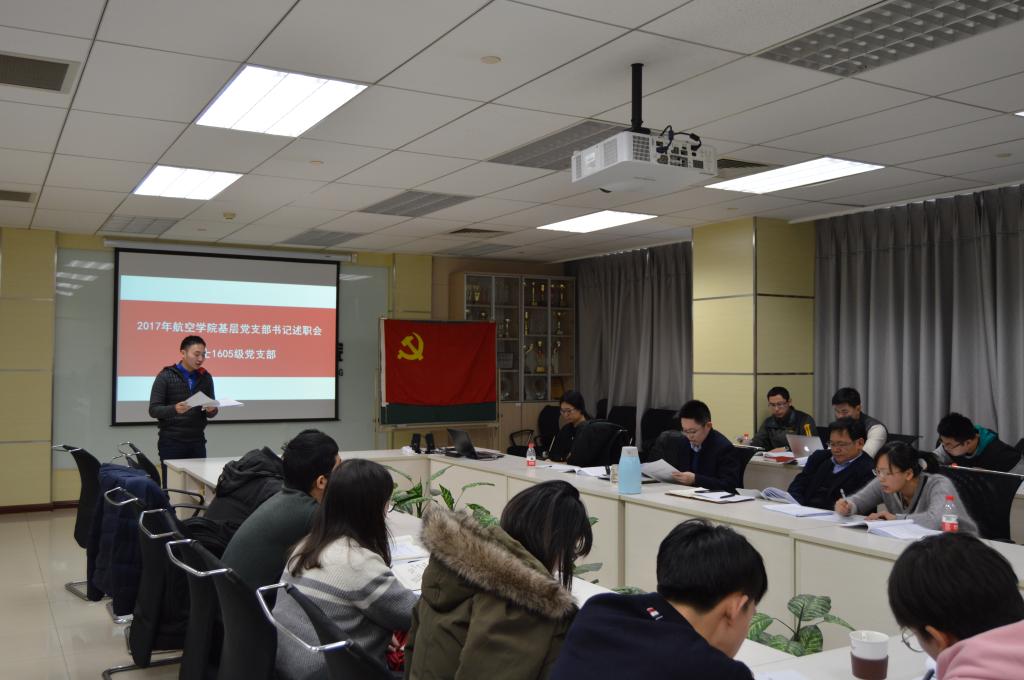 为深入学习贯彻习近平新时代中国特色社会主义思想和党的十九大精神,进一步推动全面从严治党向基层延伸,提升学生党支部组织力,充分发挥支部战斗堡垒作用,365英国上市公司于2018年1月13日在新主楼C708召开2017年度“不忘初心 牢记使命”学生党支部书记党建工作论坛暨抓支部工作述职评议会。航空学院党委书记林贵平老师、行政副院长蒋崇文老师、党委副书记梁颖华老师、分团委书记钟国老师,学院本科及研究生工作办公室辅导员以及全体学生党支部书记参加了本次述职评议会。