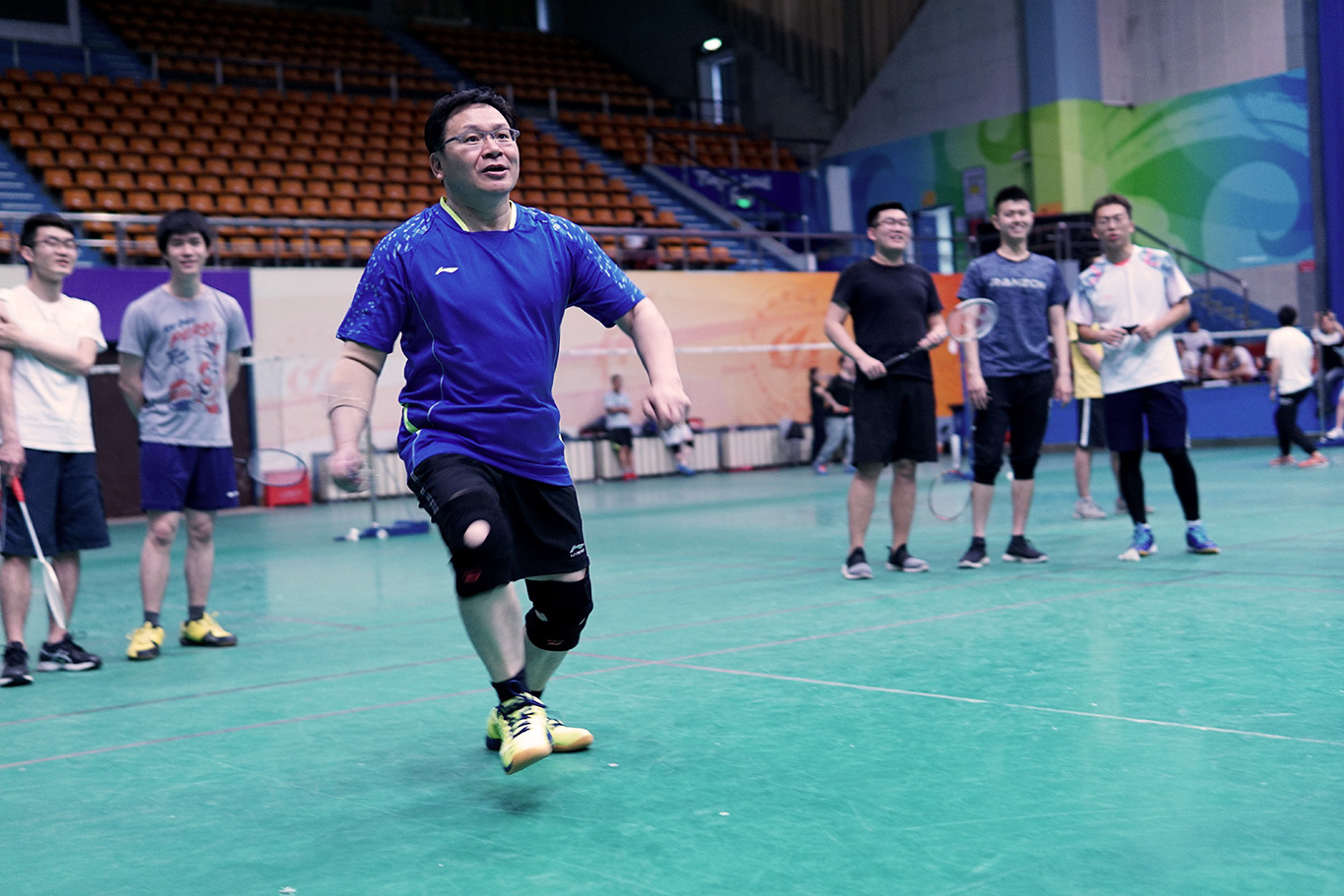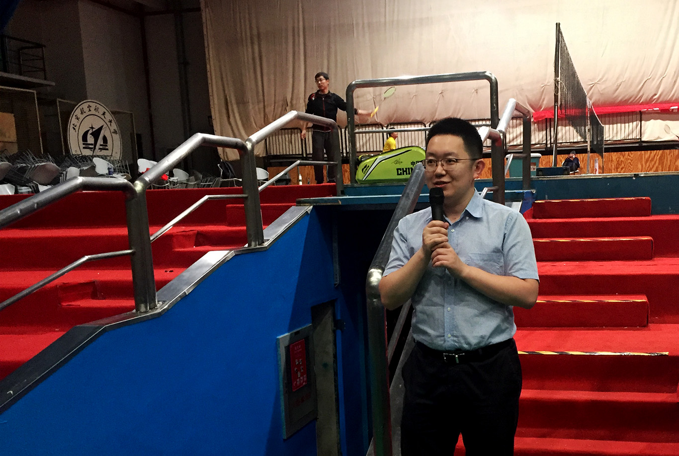 此次“星空杯”师生羽毛球赛的比赛地点为北航羽毛球馆主馆。早上7点30分左右,很多参赛选手和助威的师生就已经来到比赛场地进行热身备战,场内气氛活跃。
