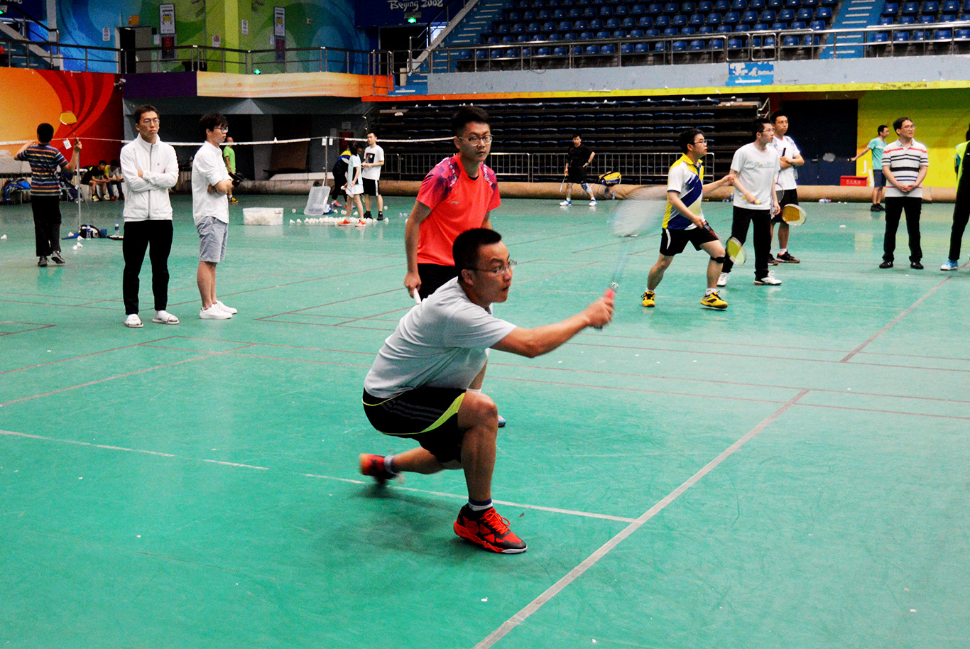 8点20分,小组赛拉开帷幕,所有参赛队伍分为A、B、C、D四个小组,组内进行单循环赛,小组的前两名将获得出线机会。比赛中每支队伍都顽强拼搏,挑战自我,赢得了场边观众的阵阵喝彩。男双的比赛异常激烈,双方队员热情高涨,斗志昂扬。混双的比赛更加精彩,女队员的网前截杀,男队员的后场吊球,吸引了大批的观众前来观战。看着场上的比赛选手腾挪跳跃、身姿飒爽,坐在场边等待的选手和围观的羽毛球爱好者们也都跃跃欲试、纷纷在练习场地上一展身手。